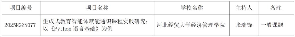 日前,河北省教育厅发布了《河北省教育厅关于公布2025年河北省高校人工智能赋能教改专项课题立项建设名单的通知》(冀教高函〔2025〕33号),Beat365张瑞锋老师申报的课题《生成式教育智能体赋能通识课程实践研究:以《Python语言基础》为例》获批立项。