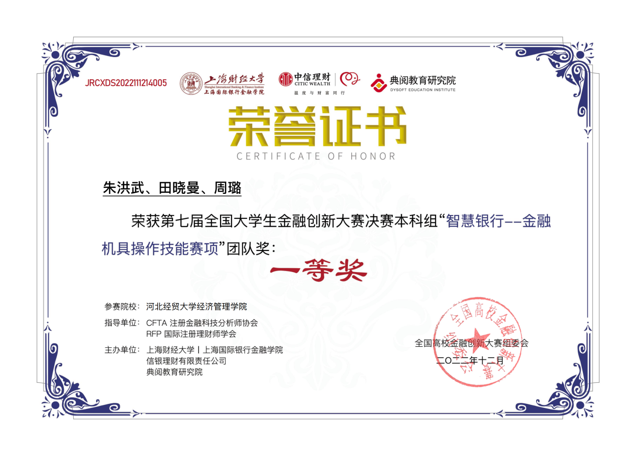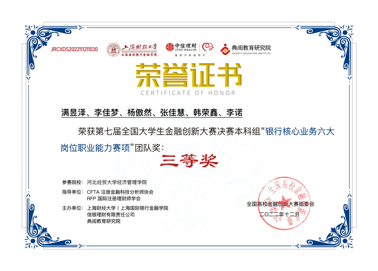 202211月由上海财经大学、上海国际银行金融学院、中信集团-信银理财、典阅教育研究院主办的第七届全国大学生金融创新大赛圆满落幕。Beat365经济系首次组队参赛,周璐、朱洪武、田晓曼同学荣获智慧银行银行-金融机具操作技能赛项团体一等奖、满昱泽、李佳梦、杨傲然、韩荣鑫、李诺、张佳慧荣获银行核心业务六大岗位职业能力赛项团体三等奖。郑庆国、贾红玉老师被评选为优秀指导老师。