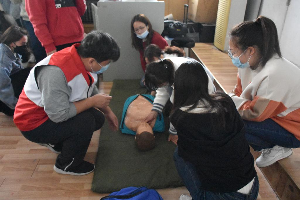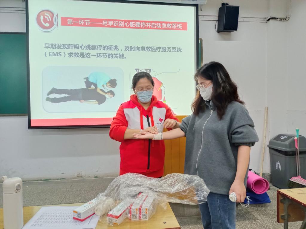 因疫情防控工作需要,本次培训以小班授课为主,减少大流量人员密集,也更利于培训老师有针对性指导新生学习。理论课上,学生们认真听讲,熟悉应急救护基础知识。实操课上,老师们详细讲解并耐心示范心肺复苏的操作步骤和创伤救护技能,指导学员们一一进行操作练习。培训现场同学们热情参与,气氛热烈。
