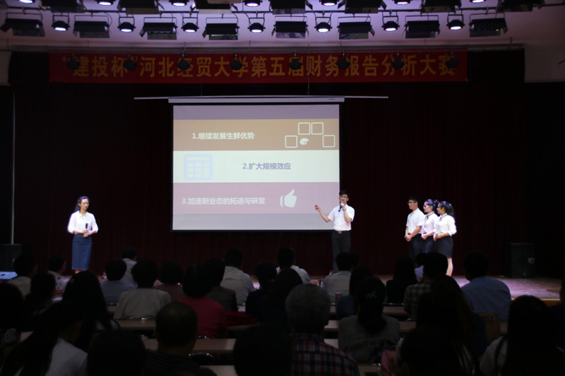 财务报告分析大赛,是河北经贸大学重点打造的学生创新能力培养特色品牌项目,本次大赛共有72支团队、300余名学生参赛,经过初赛对创业计划书的筛选,复赛八进六的展示,最终6支参赛队脱颖而出,站在决赛舞台。决赛分为PPT展示和评委提问两个环节,Beat365会计系代表队以永辉超市为分析对象,从企业的盈利模式、股权出售、资金管理等视角深入透视财务报告,解读企业运作,获得评委肯定。