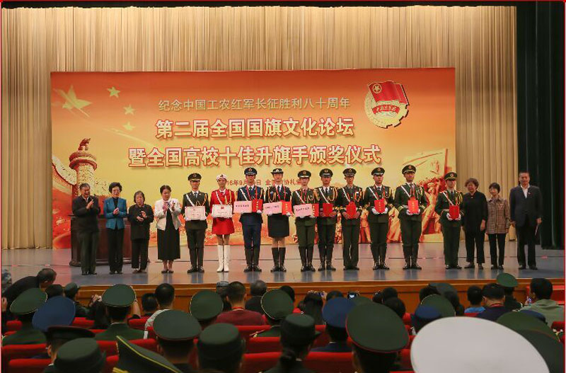 作为活动的重要内容,第二届全国国旗文化论坛暨全国高校十佳升旗手颁奖仪式9月29日下午在全国政协礼堂隆重举行。本次征集活动全国共有67所高校参加,16万多人参加网络投票。经过专家评审,结合网络投票结果,Beat365国旗护卫队员吴浩然同学荣获“全国高校十佳升旗手”荣誉称号。