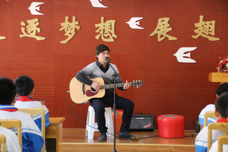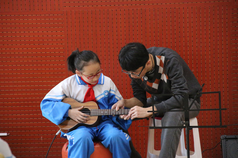 活动开始,邱学亮用简洁的语言给小学生们讲解什么是音,什么是乐。随后,“三十乐队”志愿者贺龙用箱鼓让孩子们亲自体验音乐的节奏感,志愿者卢欣舒缓优雅的吉他声一起,孩子们又跃跃欲试想上台体验一下乐曲的美感。整整两个小时的课程,孩子们听得专心致志,连老师都很惊讶,班里几个原来坐不住的孩子竟然能坚持这么长时间,还学得很用心。