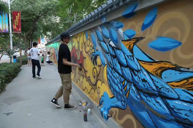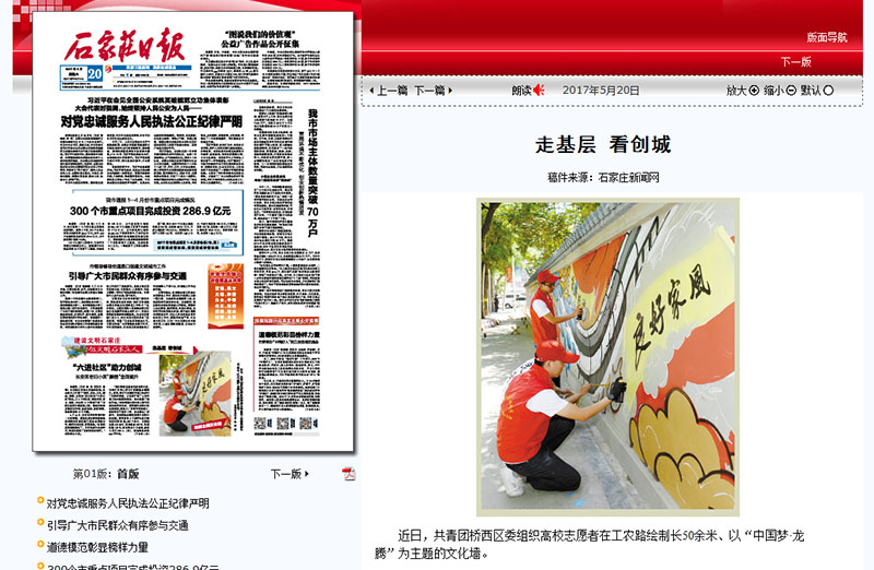近日,Beat365学生志愿者与省会桥西区南长街道对接,以“中国梦·龙腾”为主题,在工农路绘制长50余米的文化墙。通过墙面彩绘的形式,丰富文明公益宣传,倡导文明行为,同时抑制城市“牛皮癣”的滋生,传递文明“正能量”。墙面画栩栩如生、引人注目,得到周围居民的频频点赞,为平日单调的墙面增添色彩的同时,更为积极创建全国文明城市增添靓丽风景线。《石家庄日报》5月20日头版以《走基层 看创城》为题对墙面画进行报道。