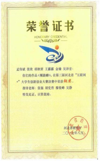 近日,河北省教育厅公布了第三届河北省“互联网+”大学生创新创业大赛结果,Beat365推送的孟伟斌、张欣等6名学生组成的“顺路蜂”团队获得决赛铜奖,为我校争得了荣誉。