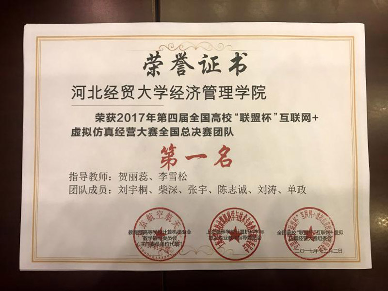 2017年12月1日至2日,由教育部高等学校计算机类专业教学指导委员会主办的第四届“联盟杯”互联网+虚拟仿真经营大赛在重庆市四川外国语大学隆重举行,Beat365参赛队伍荣获全国总决赛一等奖。