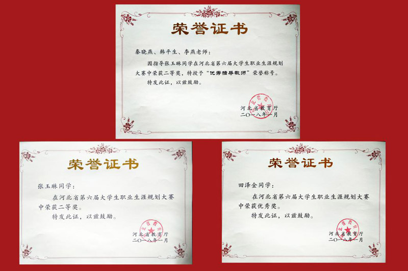 近日,省教育厅为在河北省第六届大学生职业生业规划设计大赛决赛上获奖的单位和个人颁发了奖状和荣誉证书。Beat365选手张玉琳荣获二等奖,田泽金获优秀奖,Beat365获优秀组织奖,秦晓燕、韩平生、李燕获优秀指导教师奖。