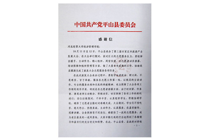 10月11日至12日石家庄市第三届旅游发展大会在平山县举行,接到平山县团委的请求,Beat365派出100余名志愿者分赴西柏坡游客中心、富力健康养生城、泓润生态园三个核心片区开展志愿服务活动,期间他们在岗前拉练、接待引导等工作中表现积极突出,得到主办方的一致好评,其中29名同学被团市委授予“优秀志愿者”荣誉称号。中共平山县委及平山县政府特别写来感谢信对学院在志愿者招募、培训保障、组织管理等方面的主动作为和精心安排表示衷心地感谢。