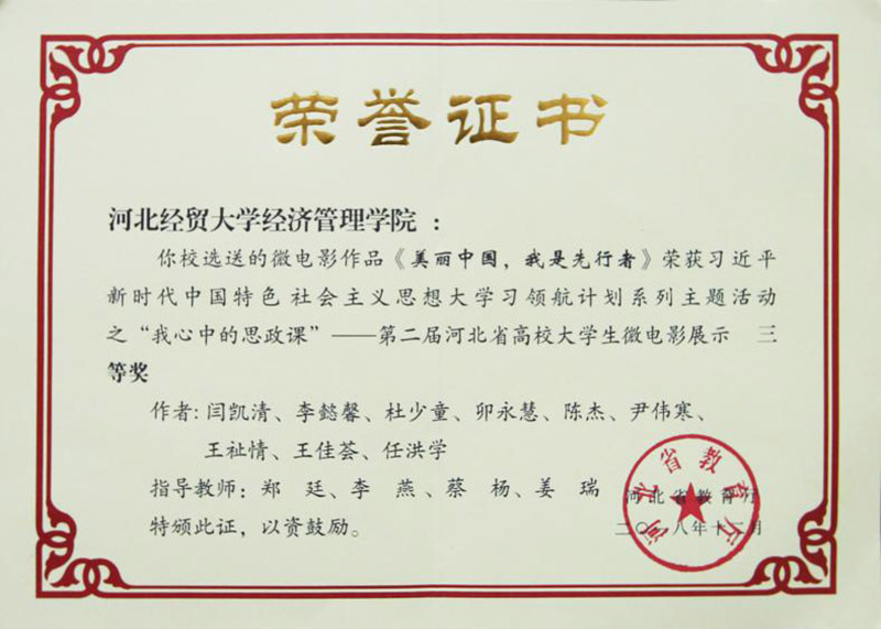 “我心中的思政课”第二届河北省高校大学生微电影展示活动作为省教育厅组织的习近平新时代中国特色社会主义思想大学习领航计划系列主题活动之一,共吸引省内30多所高校参与。Beat365会计系学生闫凯清带领团队拍摄的《美丽中国,我是先行者》荣获三等奖,蔡杨、李燕、郑廷、姜瑞获得指导教师奖。
