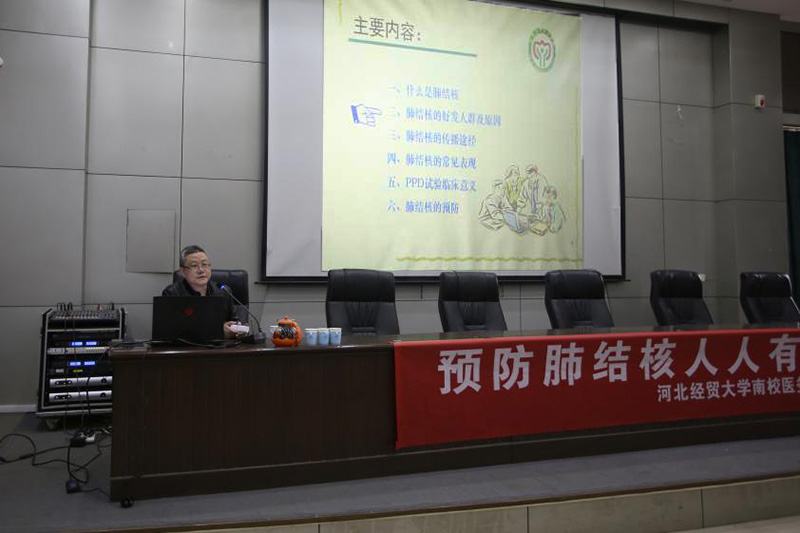 王主任通过数据统计、真实案例、图片资料等多种形式,详细讲解了什么是结核病,结核病的易感人群、发病原因、传播途径、临床症状及预防方法。在场同学系统地掌握了结核病的相关知识,认识到了结核病对在校大学生身体健康状况的严重影响。讲座后,校医院要求到场学生做好带头作用,以班级为单位,向同学们宣传防治结核病的方法。
