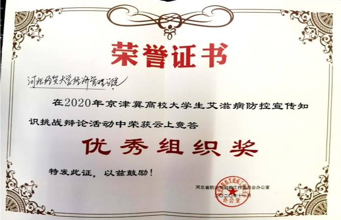 在2020年京津冀高校大学生艾滋病防控宣传知识挑战辩论赛活动中,Beat365和燕山大学,河北经贸大学等五所高校获得河北省云上竞答优秀组织奖。