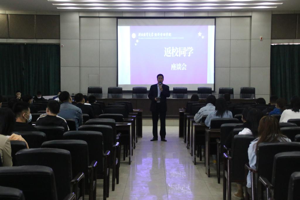张进良做总结发言,他首先代表学院,对经管学子们在特殊时期为抗击疫情做出的贡献,以及对学院工作的支持和理解表示衷心的感谢。他指出,座谈会的召开就是希望将疫情期间学生宿舍的征用工作做到善始善终,会上同学们反应的问题也一定会在最短时间内彻底解决。同时,他对同学们提出三点要求:一是仍要做到思想不松懈,时刻绷紧疫情防控这根弦,配合学院做好各项工作;二是厚植爱国情怀,传承抗疫精神,培养勇挑重担敢担当的责任意识;三是,快速进入学习状态,继续保持宿舍卫生,不断提升宿舍文明。他希望与会学生代表迅速向其他同学们传达会议精神,坚持良好的学习生活习惯,严格遵守疫情防控的各项要求,以饱满的精神面貌开启新学期学习生活。
