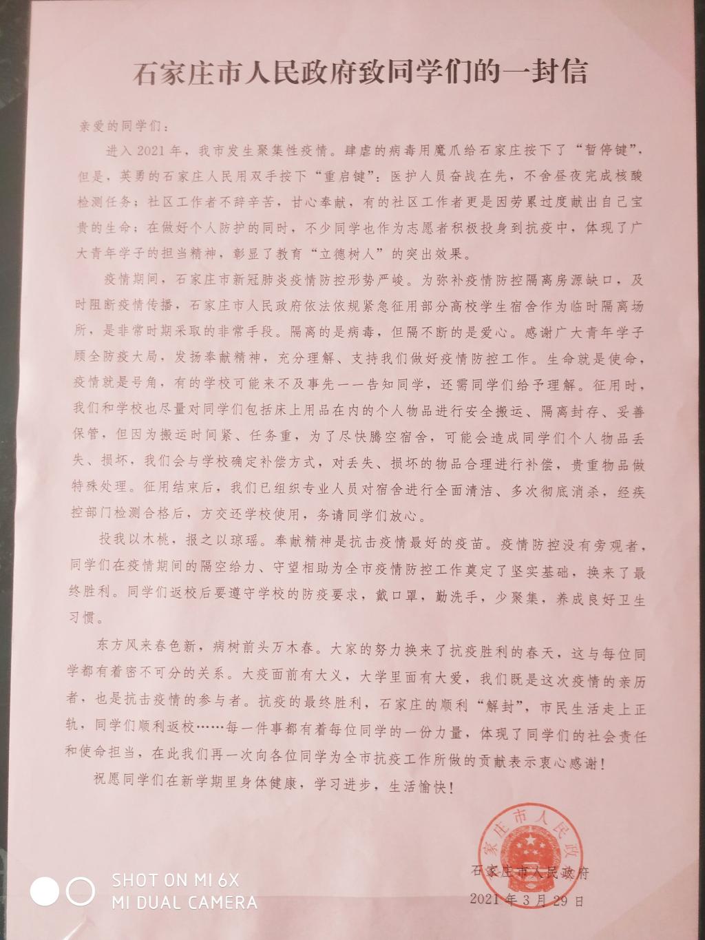 会上,学生工作部老师杨斌还宣读了石家庄市人民政府致同学们的感谢信。( 撰稿\摄影:姜瑞 )