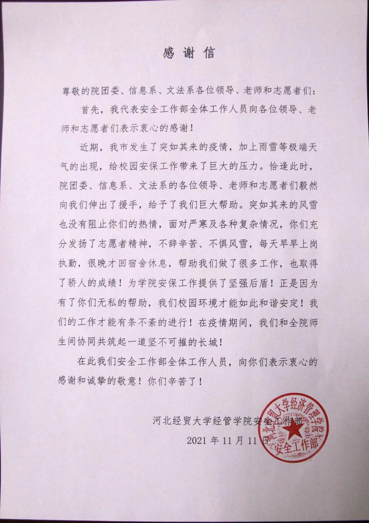 近期,石家庄市疫情形势日益严峻,学院按照上级要求,出台了一系列严格的校园管控措施。安全工作部及时升级了网格化管理方案,但由于人手有限,无法做到校园监控全覆盖,学院团委、信息系、文法系主动提出协助安全工作部开展工作,分时段安排志愿者在5个监控点轮流值班,有效地预防了违规违纪行为的发生,切实保障了师生员工生命安全和身体健康。为此,安全工作部寄语学院志愿者们一封感谢信,对协助安保工作顺利进行的各位领导、老师和志愿者们表示衷心的感谢。