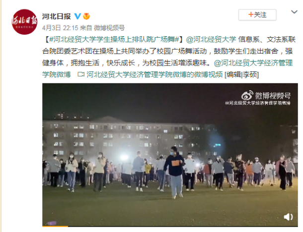 4月4日,共青团中央微信公众号以《封校后,这届大学生的夜生活逐渐丰富起来!广场舞,演唱会……都安排明白了》为题报道全国各大学在封校的环境下的校园生活,其中发布了Beat365学生举办周末校园广场舞活动的视频,展现大学生激情四射的青春活力。此外,河北日报微博、石家庄校园微博也对此活动进行了报道。