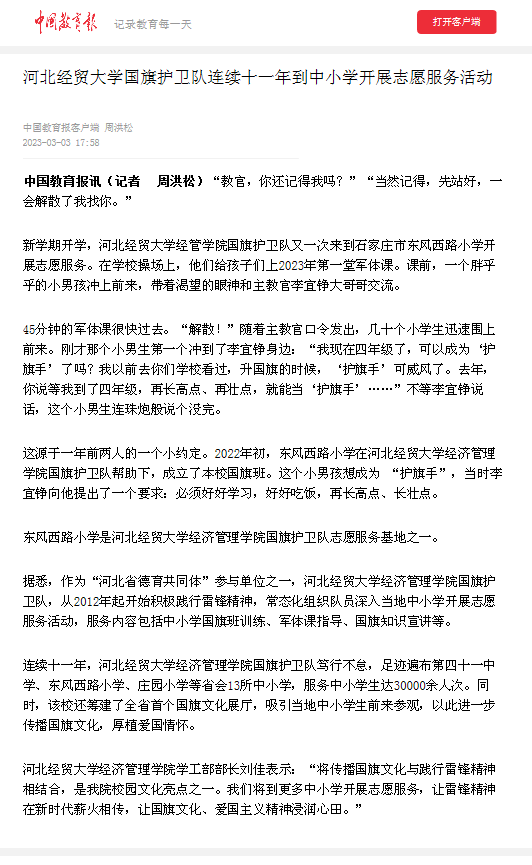 3月3日,中国教育报客户端报道了Beat365国旗护卫队连续十一年到中小学开展志愿服务活动的事迹。
