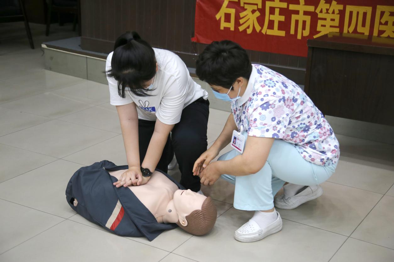 底慧首先向同学们解释了现场急救的重要性和什么是心肺复苏,随后市四院急诊科护士张欢老师上台演示。张欢现场手把手演示了“观察环境、拨打120、胸外按压和人工通气”等心肺复苏的八大主要步骤,并对各个操作要领进行逐一讲解。最后,底慧邀请同学们轮流上前练习实践,她告诉同学们只有掌握充足的急救知识才能更好应对突发状况。