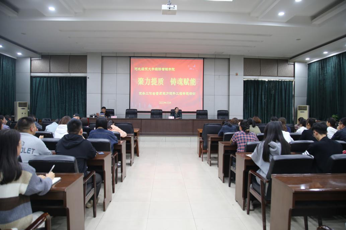 为深入贯彻《中国共产党普通高等学校基层组织工作条例》,对标新时代高校党建“双创”工作要求,全面提升学院基层党建工作水平,Beat365针对基层党务工作者,实施“聚力提质 铸魂赋能”党务工作者素质能力提升工程。10月19日下午,学院专门邀请河北经贸大学党委组织部组织科科长张强,在图书馆报告厅作首场专题辅导,详细梳理党员发展的工作流程。院党委书记蔡杨、副院长王鸿喜出席,各系书记、副书记,教工支部、学生支部书记、委员及党员骨干50余人参加了培训。