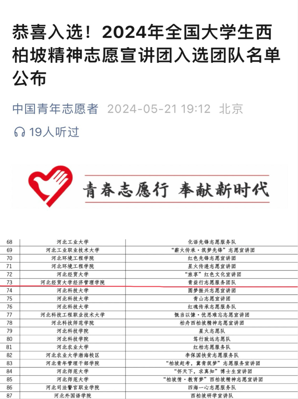 为深入学习宣传贯彻习近平新时代中国特色社会主义思想和党的二十大精神,落实“强国复兴有我”群众性主题宣传教育活动相关要求,引导动员青年学生大力弘扬西柏坡精神,团中央青年志愿者行动指导中心、共青团河北省委、中共石家庄市委、中国青年志愿者协会联合举办了2024年全国大学生西柏坡精神志愿宣讲团遴选,该活动受到全国各高校志愿服务团队广泛关注。