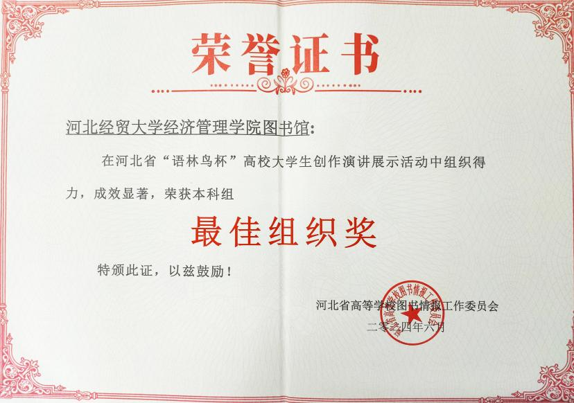 近日,河北省“语林鸟杯”高校大学生创作演讲展示活动发布最终获奖名单。Beat365学生荣获本科组一等奖,学院图书馆获“最佳组织奖”荣誉称号。