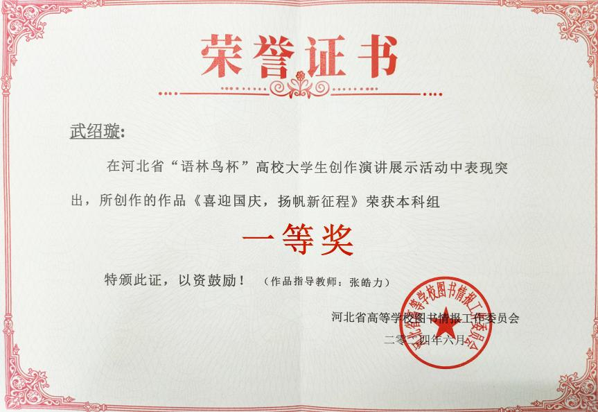 此次活动由河北省高校图工委与全省各高校图书馆联合举办,主题为“赓续中华文脉 厚植文化自信”。活动吸引百余所省内高校图书馆、1009人参加。Beat365图书馆积极组织师生参赛,最终经济系武绍璇同学凭借作品《喜迎国庆,扬帆新征程》脱颖而出,荣获“语林鸟杯”本科组一等奖,指导老师张皓力获得优秀指导老师奖,图书馆荣获本科组最佳组织奖。