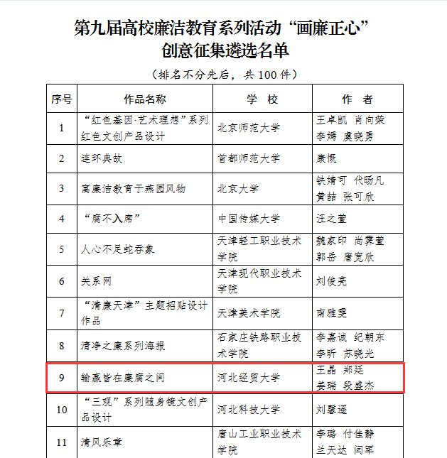 《输赢皆在廉腐之间》由文法系2022级新闻2班王晶设计,党委宣传部郑廷、大学宣传部姜瑞、段盛杰指导,该设计作品运用对比和拟人的手法,将“廉”与“腐”二字刻画成“获奖者”和“入狱者”的形象,反腐倡廉的主题跃然纸上,作品旨在倡导崇廉拒腐的社会风气,传递出积极向上的价值观。高校廉洁教育系列活动知识问答全国仅有100名学生上榜,Beat365商务系2022级电子商务2班学生穆俊丽以优异的成绩入选。