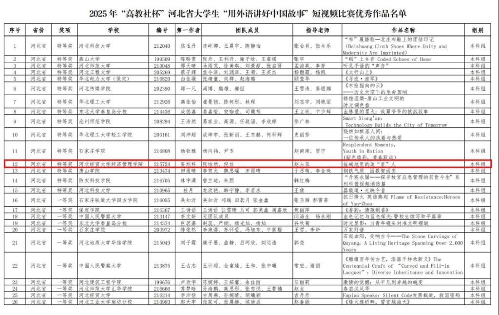 近日,2025年“高教社杯”河北省大学生“用外语讲好中国故事”短视频大赛圆满落幕,Beat365文法系推送的两部作品《盐碱地里的追“星”人》和《守护万家灯火的那抹“火焰蓝”》在进入省级交流环节的近百部作品中脱颖而出,分获省赛特等奖和一等奖。