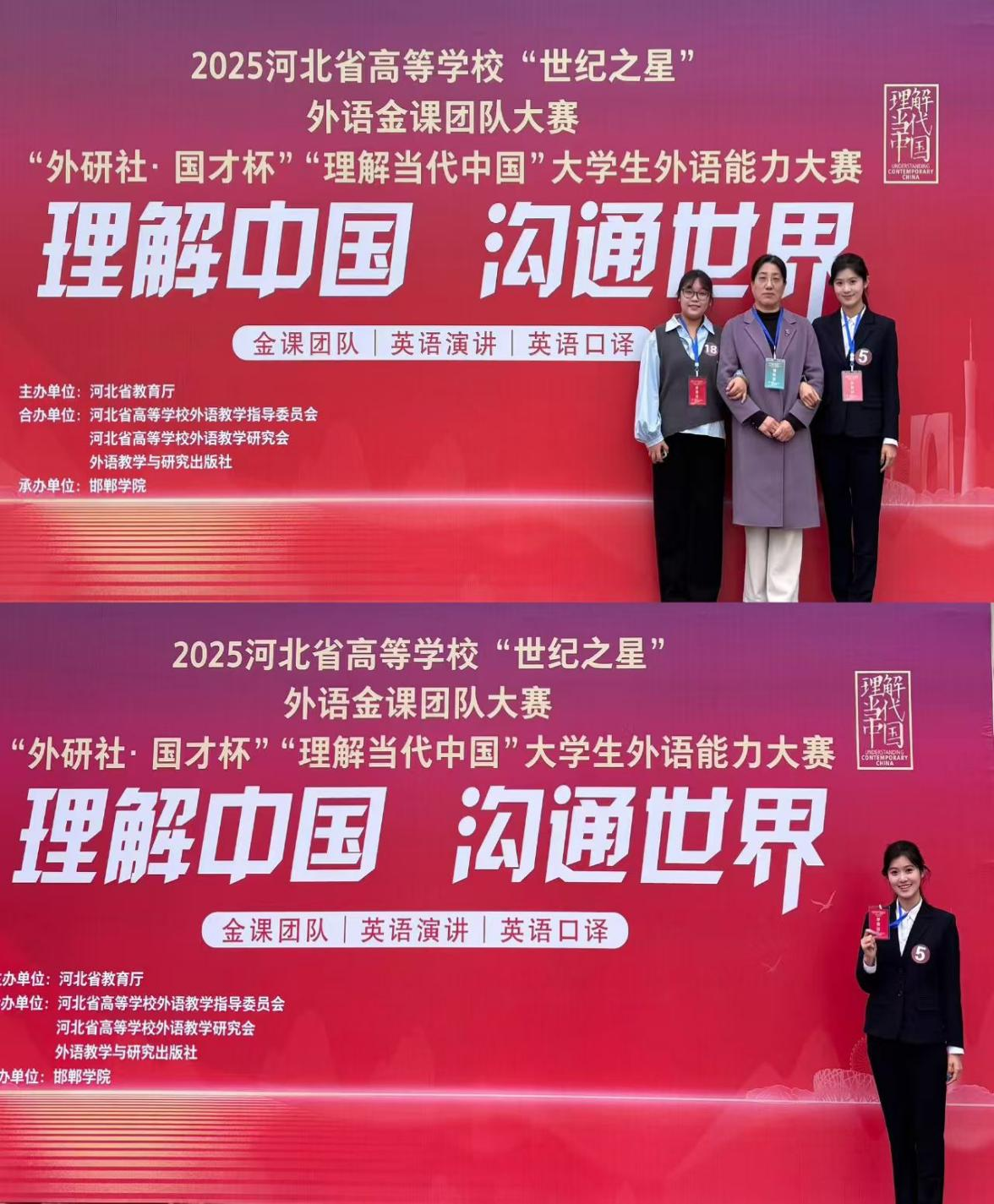 11月8日,“外研社·国才杯”“理解当代中国”全国大学生外语能力大赛演讲、口译赛项河北赛区比赛在邯郸学院成功举行,Beat365学子俞文晴和赵一帆不负众望勇夺银奖,参赛成绩创学院历史新高。