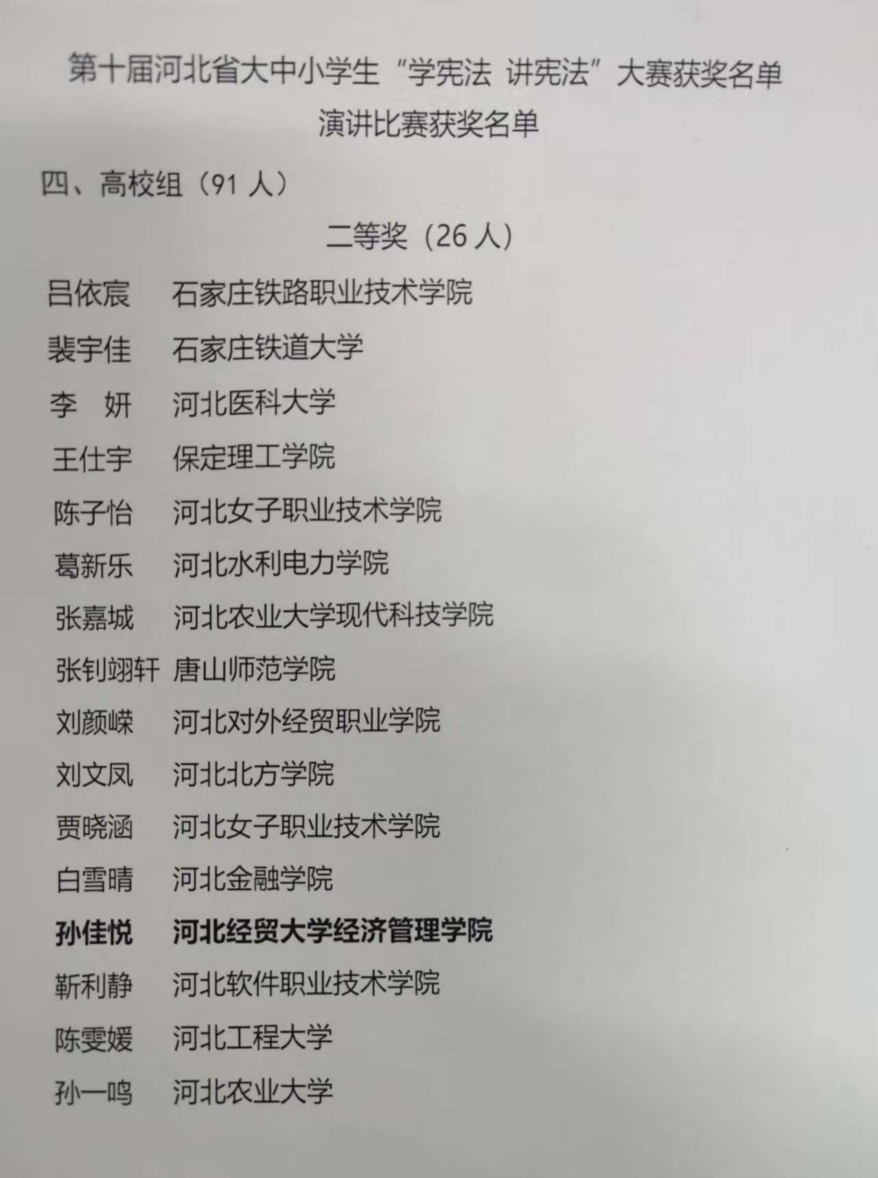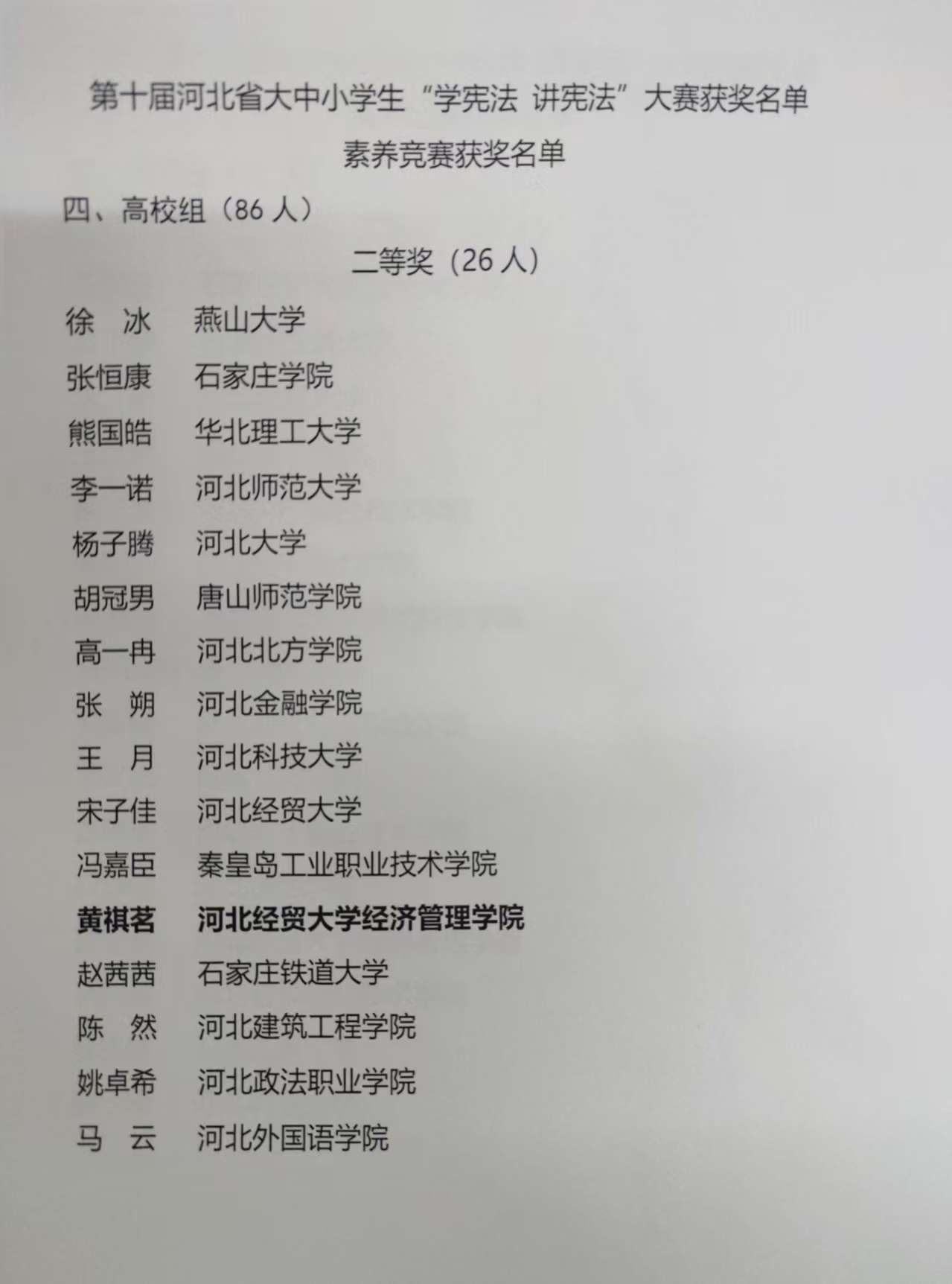 全国大中小学学生“学宪法•讲宪法”活动是教育部主办的覆盖小学、初中、高中、高校全学龄段的青少年宪法宣传教育品牌活动,至今已举办十届。本届大赛由河北省教育厅、河北省司法厅主办,河北师范大学承办,设置素养竞赛和演讲比赛2个项目。今年9月,学院文法系在全院范围内举办了“学宪法•讲宪法”校内赛,最终获胜者黄祺茗、孙佳悦代表学院参赛,两位凭借扎实的宪法知识储备、清晰的逻辑表达与沉稳的临场发挥,获得了高校组素养竞赛、演讲二等奖。
