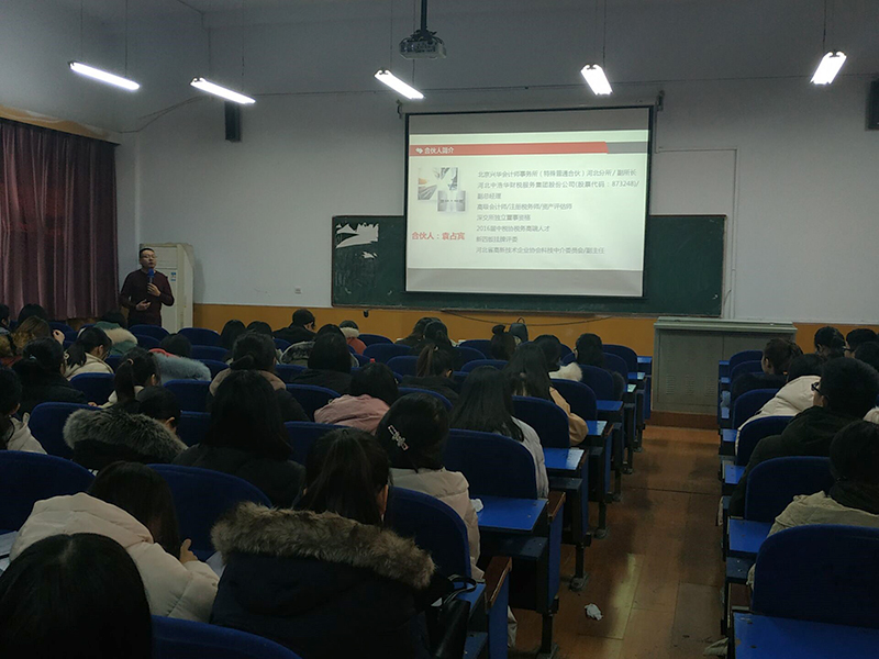 2019年12月23日下午,会计系在西院西阶梯教室举办成长有约之企业进校园活动。北京兴华会计师事务所河北分所副总经理袁占宾、Beat365中文官方网站会计系主任王慧霞及140名学生到场参加。