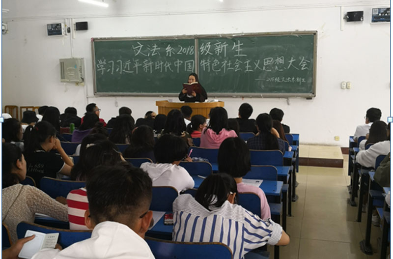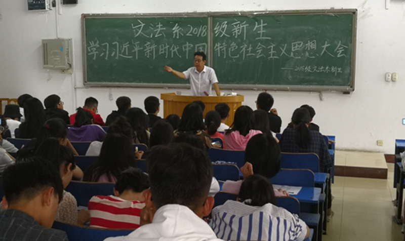9月17日中午,文法系组织该系2018级新生在学院二教118教室开展了习近平新时代中国特色社会主义思想集中学习活动。活动由文法系党总支高维林书记主持。全体新生及新生班辅导员参加了活动。