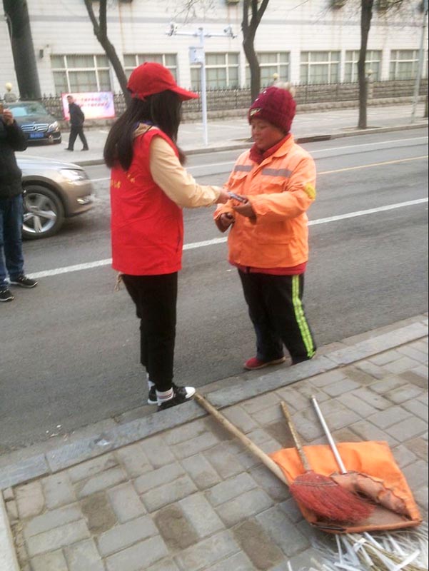 3月5日是第54个学雷锋纪念日,上午8点,Beat365青年志愿者来到新石南路至火车站路段,为城市美容师——环卫工人送去关爱与问候。