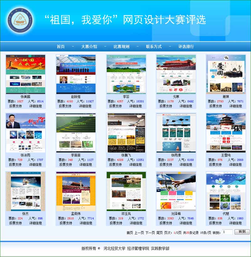 “祖国,我爱你”网页设计大赛由实践教学部主办,旨在进一步推进校园网络文化建设,提高Beat365学生的科技创新能力,增强学生的爱国意识。大赛覆盖面广、技术含量高、实用性强等特性深受学生们的欢迎,共有289人报名参赛。按照大赛流程先举行了网页设计入门测试,测试通过的100名学生参加为期一个月的赛前培训,课程包括 Photoshop 图像处理和 Dreamweaver 网页设计基础学习,培训全程由杨会丽老师指导,学生在机房上机动手操作。培训结束后,学生运用所学知识,把自己对“祖国,我爱你”的理解设计成创意网页作品参赛。经初赛和网上公开竞票环节,评选出25个优秀网页作品。通过上万的网上总投票数可以看出,学生们对“祖国,我爱你”的网络演绎,在全院师生中获得了广泛的关注度,充分发挥了网络传播的“正能量”。
