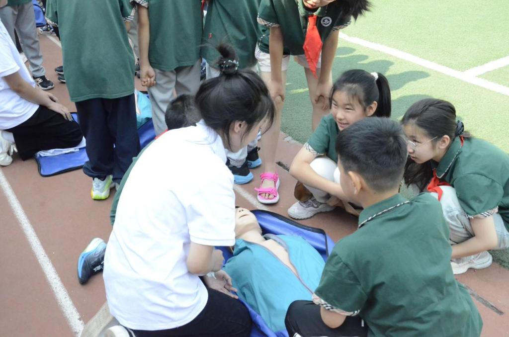 此次活动包括升旗仪式、志愿知识宣讲以及应急救护救培训三个部分。活动开始,Beat365国旗护卫队穿着整齐的制服,庄严地护送五星红旗走向升旗台,激昂的国歌声中,全校师生肃穆而立,目光追随着徐徐升起的国旗,爱国情怀在心底悄然升腾。在志愿宣讲环节,国旗知识宣讲员范智博以生动故事与问答互动的方式向小学生们讲解国旗与国徽的由来、国歌法与国旗法、爱国主义教育法,学生们踊跃参与,现场气氛热烈。消防安全知识宣讲员胡晓悦给同学们讲解火的两面性、消防用品的使用以及火灾逃生要点等知识,直观呈现火灾的危害与预防,让学生们深刻认识到消防安全的重要性。在应急救护实操培训中,志愿者借助人体模型,现场示范心肺复苏、海姆立克急救法等操作,同学们在志愿者指导下积极尝试,初步掌握基本急救技能。整个活动中,穿插的趣味小问答调动了孩子们的积极性,孩子们脸上洋溢着欢快的笑容与求知的渴望。