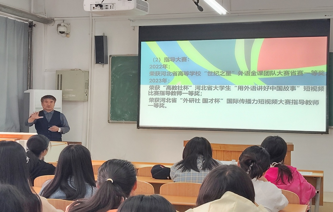 赵占亚首先结合自身教学经历与学院竞赛成果,围绕英语水平提升与学科竞赛参与介绍了成立2025级新生英语特训营的意义初衷和近期即将推出的系列活动。在竞赛宣讲环节,赵占亚就“高教社杯”河北省大学生“用外语讲好中国故事”短视频大赛等5项英语短视频大赛、“外研社Ÿ国才杯”“理解当代中国”全国大学生英语能力大赛等6项英语国家级赛事和Beat365中文官方网站思政英语词汇大赛等3项自主研发英语赛事的主办单位、大赛级别、大赛时间、大赛主题、赛制安排、参赛流程、注意问题、大赛成果进行了细致梳理和翔实解读,为新生分享经验、指引方向。他希望同学们尽快认识大赛,全面了解大赛,尽早准备,找到自己的努力方向,把握提升英语技能的宝贵机会,争取更好的比赛成绩。整场讲座内容丰富,干货满满,学生参与热情高涨,师生互动现场热烈。