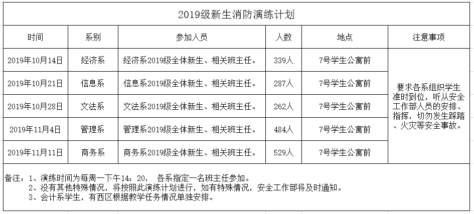 为了使2019级新生了解、学习更多的消防知识,提高他们的自救能力,根据学院工作安排,特组织2019级新生进行消防演练。具体时间安排如下:
