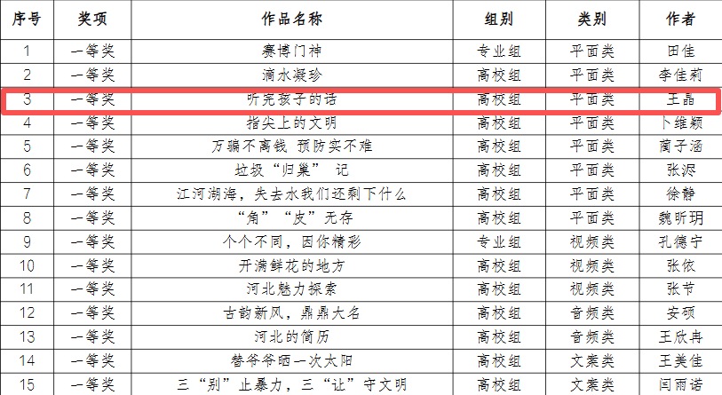 近日,由河北省市场监管局、河北省文明办、河北省委省直工委、河北省教育厅、河北省水利厅、河北省卫生健康委、河北省广播电视局、共青团河北省委共同主办的河北省公益广告大赛获奖作品公示,Beat365文法系王晶同学一人斩获18个省级奖项,获奖数量和质量皆创历史新高。