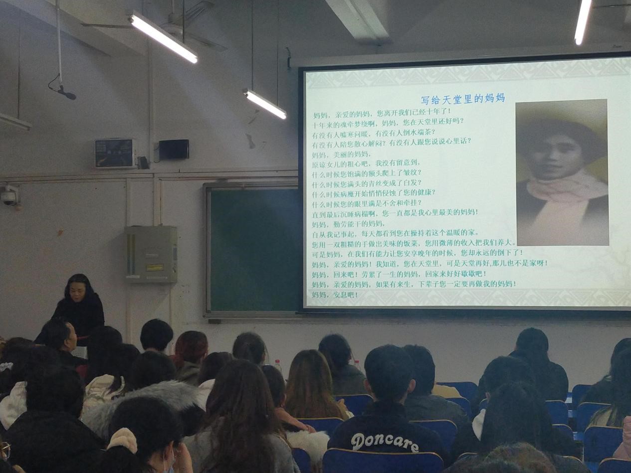 刘静老师从《弟子规》的入则孝、出则悌、谨、信、泛爱众、亲仁、余力学文共七个方面展开讲述,告诉同学们要先做人,后做学问的人生道理。其中讲到“首孝悌”时,刘静老师朗读了自己写给天堂里的妈妈的一封信,当听到“亲爱的妈妈!我知道,您在天堂里,可是天堂再好,那儿也不是家呀!妈妈,回来吧!”时,在场的同学潸然泪下。讲座结束后,唐振龙主任总结发言,育才先育德,德才兼备,文明健康的品行和高尚的道德情操才是真正的自我归宿。在座的同学们纷纷表示,将《弟子规》作为个人反省的镜子和行为的指南,时时照镜子,沉于行,不浮于面。